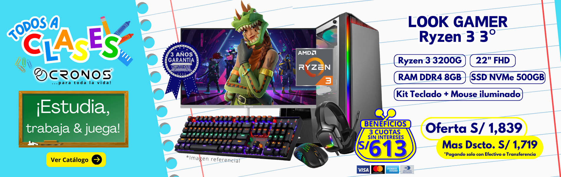 PC CRONOS Vision R3-3 "A", RAM 8GB, SSD 500GB, Monitor 22″ FHD, Kit Teclado + Mouse, Parlantes o Audífono.
